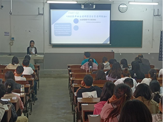 交流会开始,主持人介绍了本次活动的目的和安排,随后邀请辅导员李宇老师上台发言。李宇老师结合近六年考研情况,从报考专业、复习方法、心理调节等方面,为同学们提供了一些实用的考研建议,并鼓励同学们根据自身的兴趣和能力,做出合理的选择。接下来,旅游管理1912班刘佳同学和地理科学1911班龚元弘扬同学从学生角度进行了详细的经验分享。他们分别介绍了自己的考研动机、准备过程、考试感受等,并分享了一些复习资料和技巧。他们表示,考研是一场持久战,需要有坚定的信念、良好的习惯、科学的方法和积极的心态。他们还回答了同学们提出的一些问题,让大家收获很多。