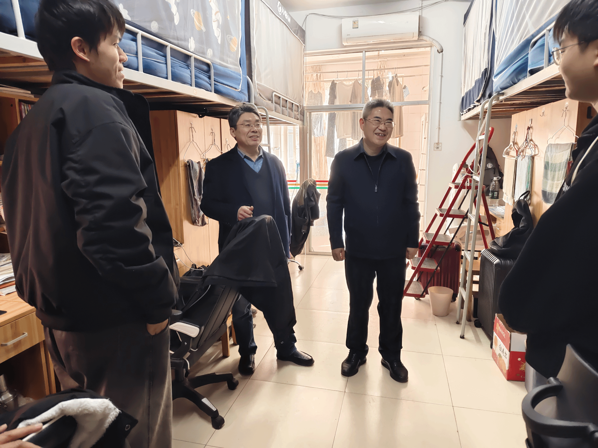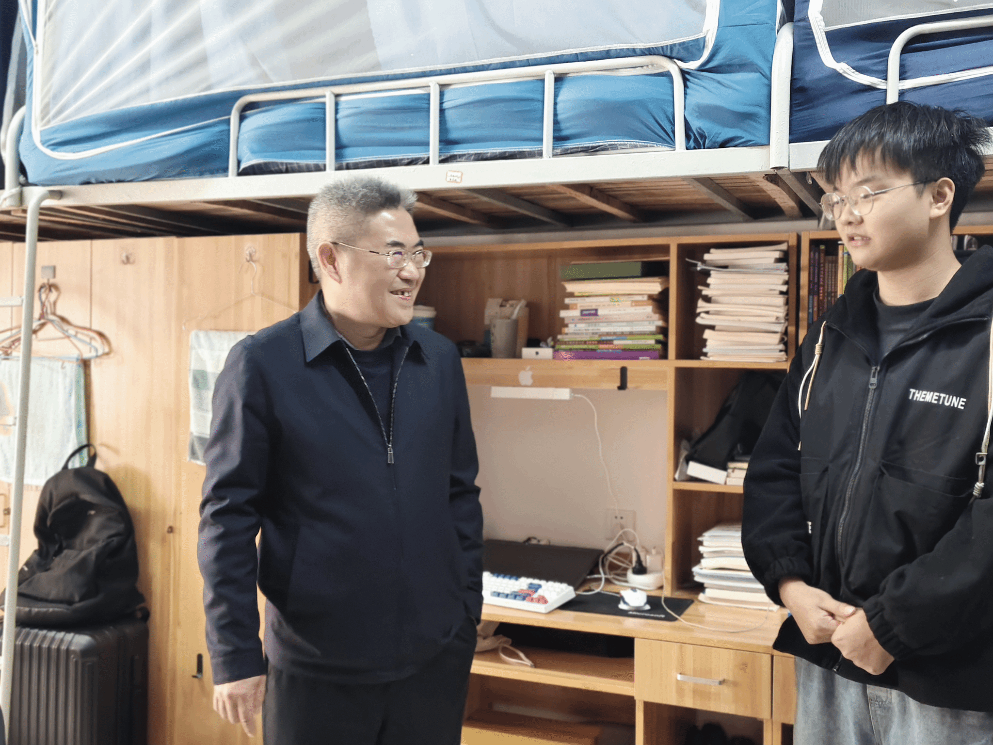 在北区11栋103宿舍,张宇辉与地理科学2411班学生曾旭亲切交谈,细致了解其学习生活状况,并就宿舍安全、环境卫生、人际关系及学业规划等方面进行关心与指导。张宇辉结合具体事例指出:“宿舍是同学们在校生活的重要场所,维护好安全、整洁、和谐的居住环境,是健康成长与共同进步的基础。希望大家互帮互助,合理安排时间,做到学业与生活平衡发展。”