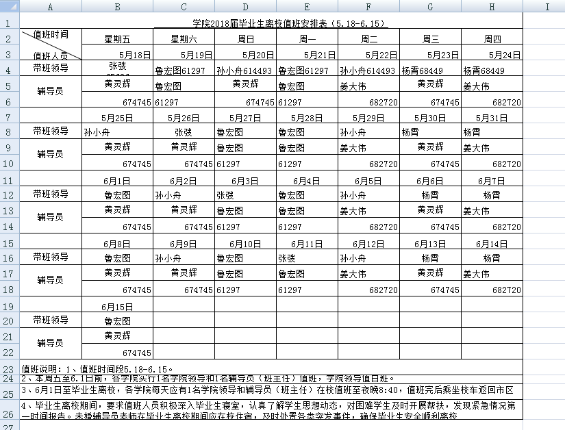 资环学院2018届毕业生离校值班安排表