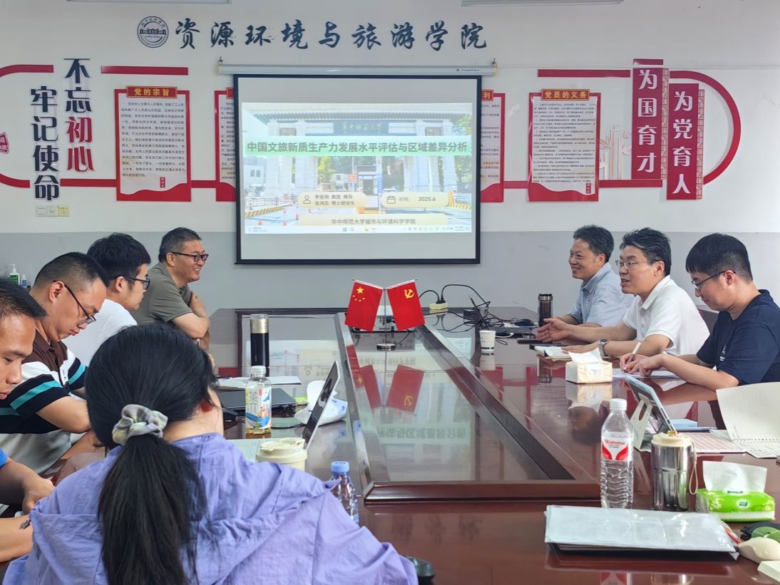 (资环学院 通讯员 何让泽) 文旅新质生产力如何推动中国式现代化?我校杰出校友、华中师范大学城市与环境科学学院教授、博士生导师李星明教授应邀来资环学院为这一时代命题提供了深刻的解答。6月14日下午,李星明教授为资环学院师生带来了一场主题为《中国文旅新质生产力发展水平评估与区域差异分析》的精彩学术交流活动。资环学院院长张弢主持会议,同为我校杰出校友的襄阳市政协副秘书长李琼、汉江研究院执行院长朱运海、资环学院副院长孙小舟等领导和专家共同参与了此次学术会议。