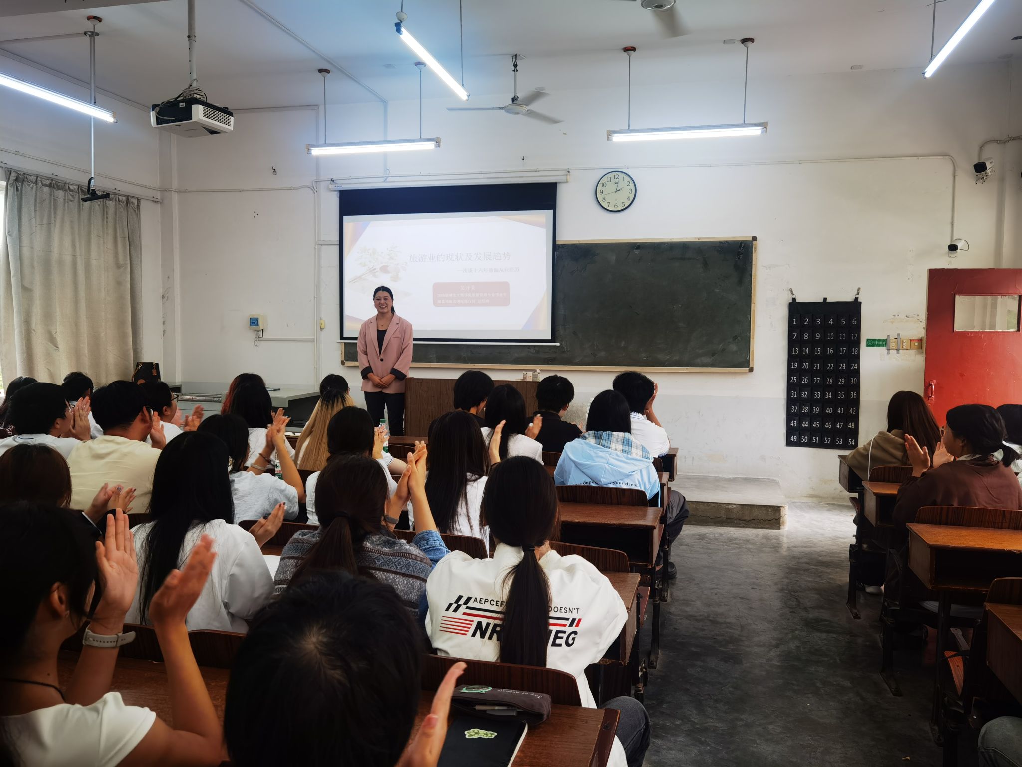 讲座中,吴开美结合十六年行业深耕经验,从“行业现状—挑战机遇—能力培养”三方面展开分享。她以“老年化旅游市场崛起”“大数据赋能文旅”“文旅+融合创新”等趋势为切入点,剖析了旅游业从“资源驱动”向“创新驱动”的转型逻辑,重点解读了“新零售+新旅游”“数字化营销”等行业升级路径。针对新生关切的职业规划,她建议构建“T型知识结构”:既要夯实旅游管理核心课程基础,考取导游证、教师资格证等职业证书,也要主动涉猎数据分析、新媒体运营等跨界技能,通过参与“三下乡”实践、校企合作项目积累实战经验。
