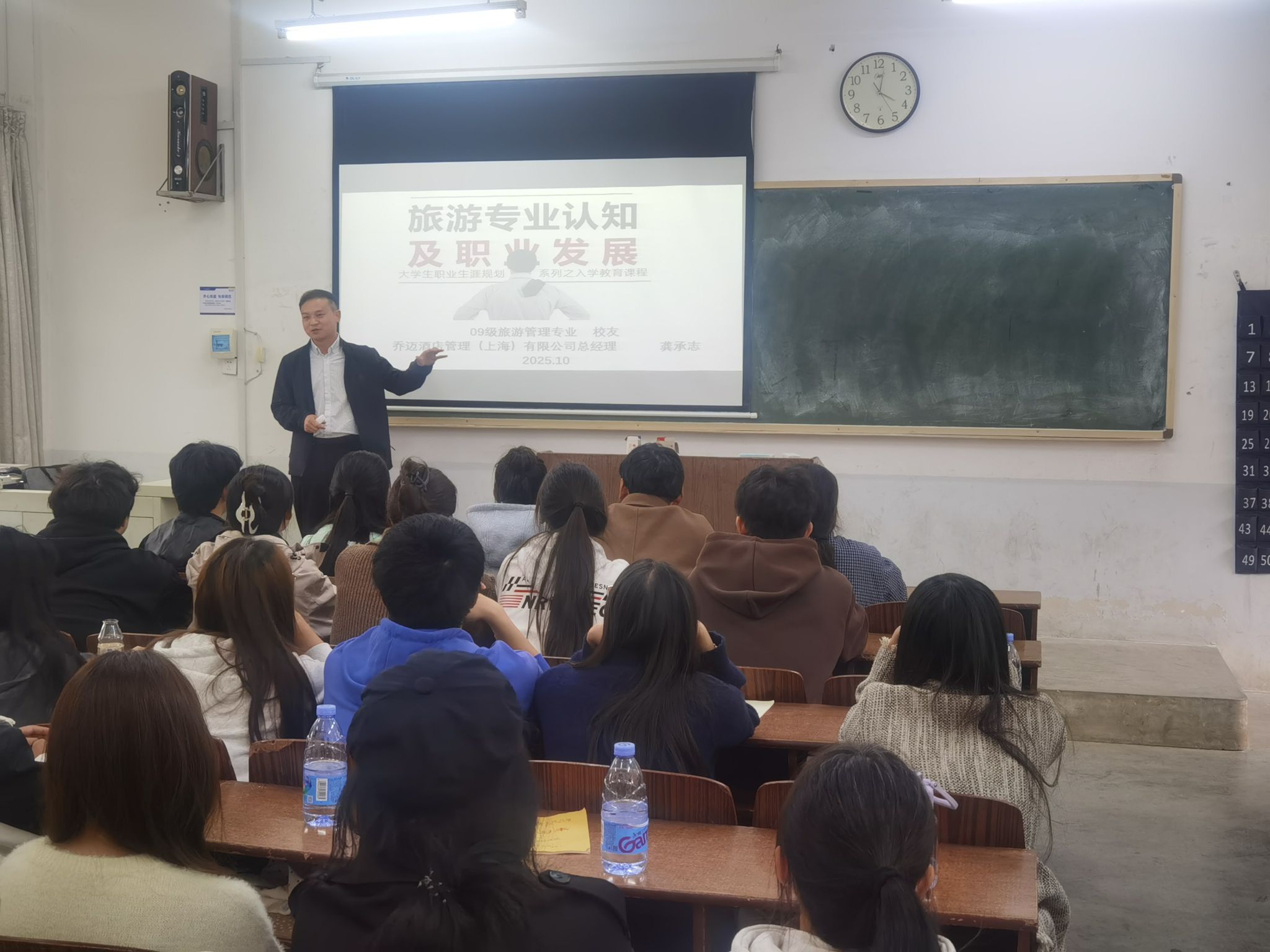 (通讯员 王天天)为帮助新生快速适应专业学习、明确职业发展方向,10月11日下午,VSport -(CHINA) 胜利因您更精彩在N4-103教室举办2025级旅游管理专业新生教育系列专题讲座。乔迈酒店管理(上海)有限公司总经理、2012届校友龚承志应邀担任主讲,资环学院副院长龙雨萍、旅游管理系主任王天天及全体新生参加。